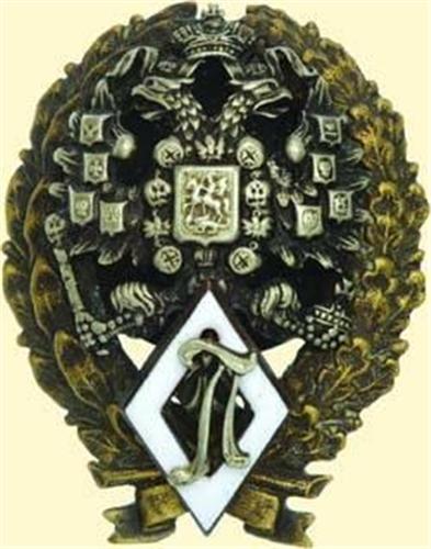 Headmaster of a Government School (Werlich) or Academic Pharmacist (Patrikeev); breast badge with screw back, tombak and white metal, four parts construction, with white enamelled rhombus with superimposed cyrillic "P", screw with additional iron disc and small nut. Signs of age and wearing. (A.- W. 604, Patr.I/2.81.)