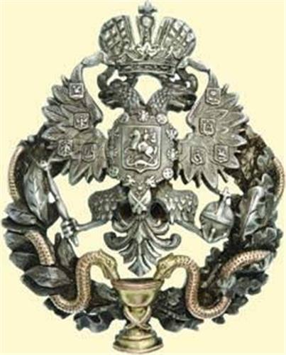 Imperial Military Medical Academy; breast badge with screw back, silver, snakes and goblet gold, multipart construction of solid cast parts, Old Russian hallmarks ("84 Archangelsk 1880-1890); screw, small normal nut. Interesting version, very fine obverse but crude reverse. Signs of wearing. (A.-W. 74, Patr.I/1.1.35)