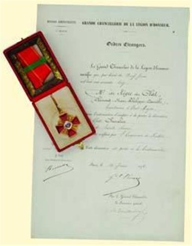 Knight's Cross (3rd class); breast badge, gold, both sides enamelled, medallions painted, Old Russian hallmarks ("56" St. Peterburg), maker's mark on reverse "AK" and Russian eagle; with gold wire suspension loop and long original ribbon, with original small red leather box with Russian inscription. Excellent old quality and very fine condition, two tiny enamel damages on reverse! Together with French document of permission to accept the Russian Order of Saint Anne 3rd class for a French officer 1876.