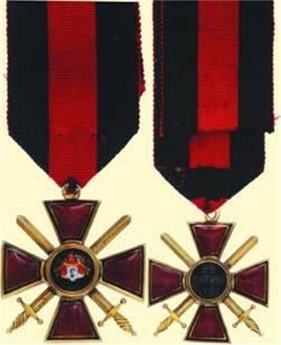 Knight's Cross with Swords (4th class); breast badge in three-quarter's size; gold, thick version, both sides enamelled, crossed golden swords, with illegible Old Russian hallmark and maker's mark; with long old original ribbon. Excellent old quality with small enamel damage on obverse medallion. Rare version!