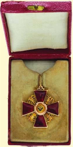 Knight's Cross (3rd class) for Nonchristians; breast badge, gold, both sides enamelled, with partially enamelled eagle's medallions, Old Russian hallmarks ("56", Kokoshniks), maker's mark on reverse ("Eduard"), with gold wire suspension loop and long original ribbon; with original goldprinted red leather box of issue. Very fine old quality with small signs of wearing.