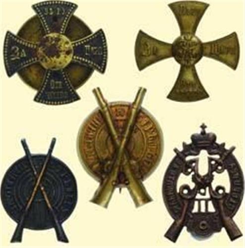 Lot of Five Militia and Shooting Badges; different types and versions, all bronze or tombak, with screw, with pin or without. All with signs of age and wearing! (Patr. II/11.12, II/12.4.a,b,w).