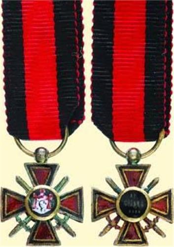Miniature Cross with Swords; breast badge in very small size (diam.: 11 mm), silver gilt, both sides enamelled, medallions painted, suspension ring with hallmark and maker's mark (?), with old ribbon. Fine quality with small signs of wearing.