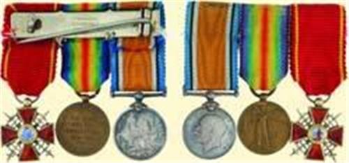 Miniature Group of Three; British War and Victory Medals / WW I (silver, bronze); Order of St. Anne, Knight's Cross 3rd class with swords (silver gilt, both sides enamelled, painted medallions); with original ribbons mounted to pin bar (SPINK&Son...London). Small signs of wearing, excellent British quality!
