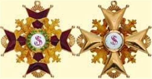 Knight's Cross 1st class -old type; sash badge, gold, obverse enamelled cross, painted medallions, old type Russian eagles in the angles, Old Russian hallmarks (St. Peterburg), Russian eagle's mark on upper arm on obverse. Excellent Old Russian jeweller's quality from second half of 19th century in near best condition, only one tiny enamel damage on reverse medallion. Very rare and impressive version!