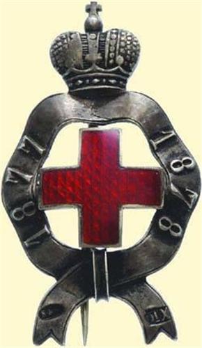 Red Cross Badge 1877-1878 (Russian-Turkish War); breast badge with pin back, silver patinated, red enamelled cross, Old Russian hallmark ("84 St. Peterburg"), maker's mark ("JU.CH" ? / in cyrillic letters), vertical pin on reverse. Fine wide version with some signs of wearing. (A.-W. 851, Patr.I/7.1.)