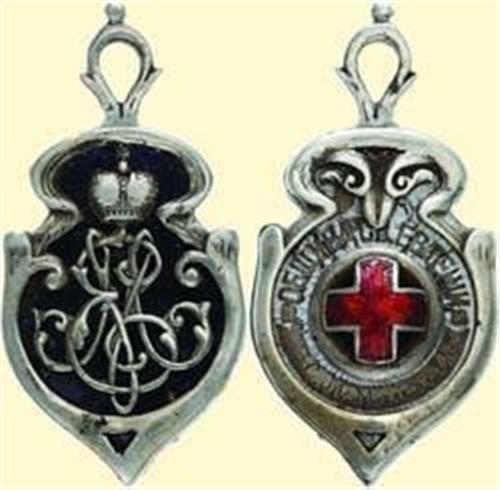 Red Cross Society of St. Eugene; Jetton with suspension loop, white metal / bronze silver plated, both sides partially enamelled, with name on obverse ("N.M.Mailow" in cyrillic writing). Significant signs of age and wearing, enamel damages, remains of glue (loop). (W. / Jet. J-154)