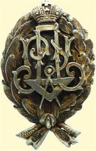 Riga Polytechnical School; miniature badge with screw back, silver partially gilt, two parts construction, Old Russian hallmark ("84..."), maker's mark ("F.G." / in cyrillic letters), screw with nut. Very attractive Old Russian quality. (A.-W. 754, Patr.I/2.6.)