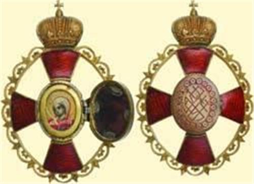 Russian Orthodox Society of the Holy-Virgin of Kholm; breast badge with pin back, bronze, partially gilt, obverse partially enamelled, central medallion with openable lid, inside a painted picture of Maria; reverse with inscription (name of the badge), maker's mark ("JA.SIWON..." ?). Significant signs of age, wearing and restoration (enamel lacquer, etc.). (A.-W. 912, 913, Patr.I/15.10)