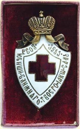 Society of the Red Cross - Badge; breast badge with crown and pin back, silver gilt, obverse enamelled, Old Russian hallmarks ("84 Kokoshniks"), maker's mark ("A.F" / in cyrillic letters), strong vertical pin on reverse. In small cardboard box. Small signs of wearing, very fine old quality! (A.-W. 853, Patr.I/7.5.)