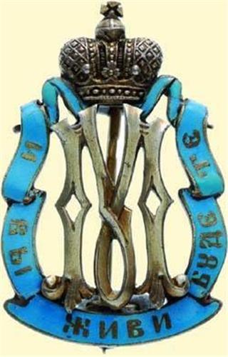 Staff Members of the Orphan Asylum under the Auspices of Empress Marie; breast badge with pin back, silver, slightly gilt, obverse partially enamelled, Old Russian hallmarks, maker's mark ("IR"), with name inscription (M.W.Semjakina). Excellent Old Russian quality and very fine condition! (A.-W. 831, Patr.I/2.74a.)