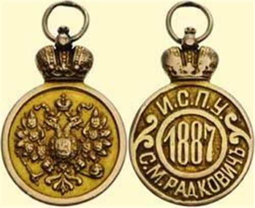 University of St. Peterburg; small crowned medal, gold, weight 4,9 gramme, diam.: 19,0 mm; inscription on reverse "I.S.P.U. (Imperial St. Peterburg University) - 1887 - S.M.RADKOWITCH"; with small suspension ring. Small signs of wearing, very attractive! (compare A.-W. 719, W.Jetons J-168)