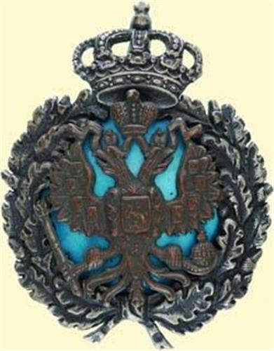 Unidentified Badge; breast badge with screw back, bronze silver plated oak leaves wreath with large crown, central background light blue enamelled, superimposed bronze imperial Russian eagle, maker's mark on reverse (?), numbered "375"; screw with additional disc and nut. Interesting design, but centre a bit loose, signs of age and wearing! (A.-W. ---, Patr. ---)