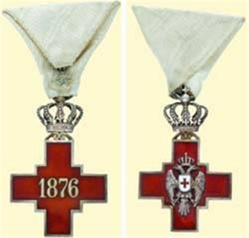 Breast badge, silver, both sides enamelled, hallmarked suspension ring ("800" and old Serbian import mark before 1919), with original triangular ribbon. Very fine old conical version!