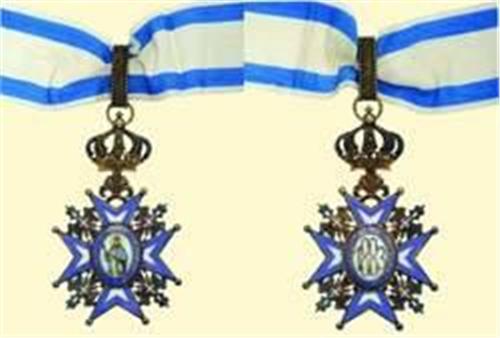 Commander's Cross (3rd class); neck badge 3rd type, silver gilt and enamelled, St. Sava with light blue-green coat (variant picture!), small crown, hallmarked ring ("935"), original suspension loop and ribbon. Excellent quality, rare version with some patina!