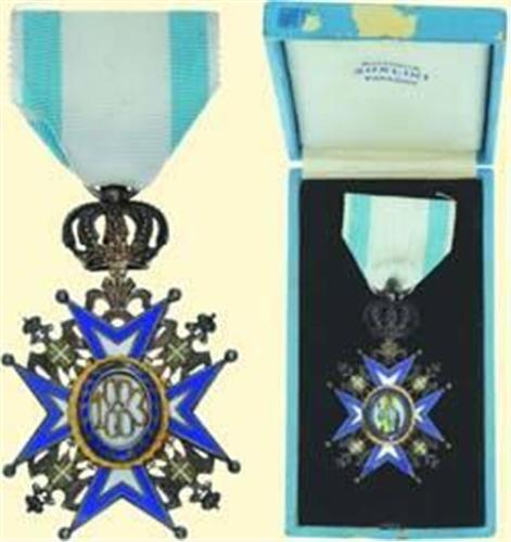 Knight's Cross (5th class); breast badge 3rd type, silver enamelled, St. Sava with green-blue coat, with suspension ring and short new ribbon; in original box of issue ("Kovnica SORLINI, Varazdin). Fine quality with small enamel damage on reverse medallion, some patina.