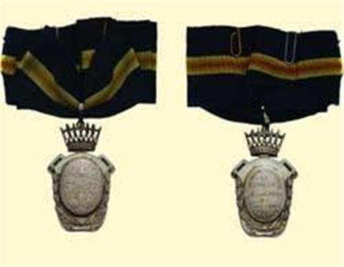 Neck medallion in silver, surmounted with a crown; allegory of arts and sciences on the obverse and complete title of the Institution, inscribed on the reverse. With neck ribbon. Very decorative and in fine condition.