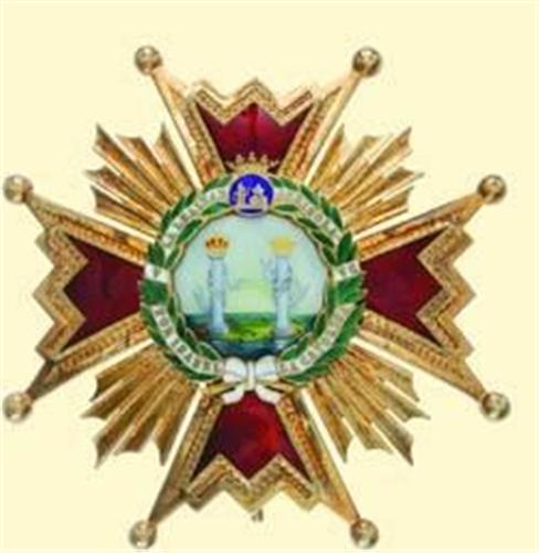 Grand Cross Breast Star; breast star 3rd type, silver gilt, superimposed parts enamelled, central medallion gold and enamel painting with a shine like mother-of-pearl, small five pointed crown on wreath of medallion, thin pin and two side hooks on reverse. Superb quality in best condition! Breast star of very high attractivity!