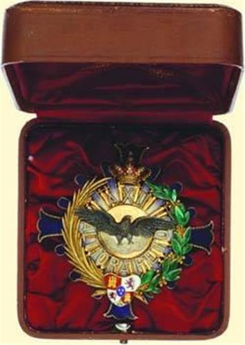 Grand Cross Breast Star; corpus silver gilt and enamelled, superimposed parts silver, partially patinated, gilt, enamelled, multipart construction, size 85 x 85 mm; thin pin and two side hooks on reverse; with original leather box of issue (MEDINA...MADRID). Phantastic florid design and best old jeweller's quality! Small enamel damages on green laurel wreath, colourfull and very attractive!