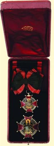 Grand Cross - Complete Set; Sash badge in silver and red enamel; the centre-piece in gilt bronze and enamels; with sash. Breast star in silver, gilt bronze and enamels, pin and two hooks on the reverse; in an older Spanish case of Cejalvo, Madrid, made for a grand cross. A scarce set.