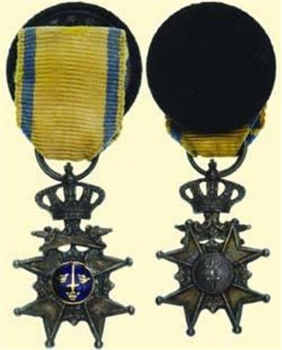 Miniature Badge of the Sword; breast miniature, silver, obverse medallion gold enamelled; with original small ribbon and button. Some old patina!