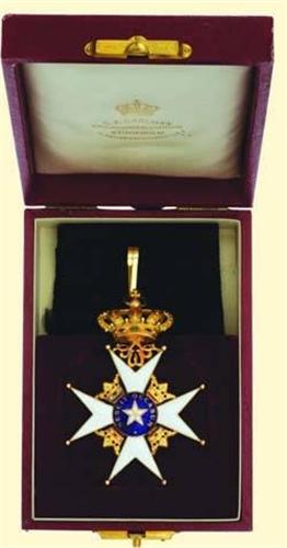 Commander's Cross; neck badge, gold enamelled, with original suspension loop and wide black ribbon. In original red box of issue ("C.F.CARLMAN, Stockholm"). Usual excellent quality, tiny enamel cracks