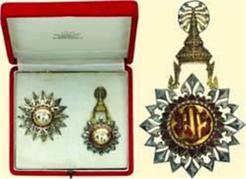 Grand Cross - Complete Set; sash badge and breast star, both silver, partially gilt and enamelled, original crown suspension on badge, wide tapered pin with maker's mark on reverse of breast star; with original complete sash, in original red velvet box of issue with superimposed gilt symbol figure (SAHASINPA...Bangkok). Very fine quality from the middle of 20th century, fine patina!