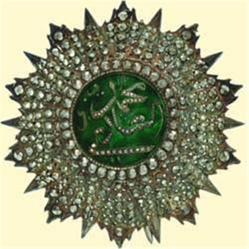 Breast Star - Type Ali Bey (2nd version); breast star, silver brilliant cut, medallion green enamelled, reverse with strong pin and side hooks, with Arabic mark. Excellent North African quality with stylized cypher of Ali Bey (2nd version), small fine patina, very attractive!
