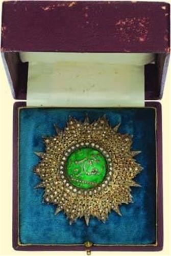 Breast Star - Type Ali Bey (2nd version); breast star, silver brilliant cut, medallion green enamelled, reverse with strong pin and side hooks, with Arabic mark. With original old box with goldimprint. Very fine North African quality with stylized cypher of Ali Bey (2nd version), nice old patina! This box is rare!