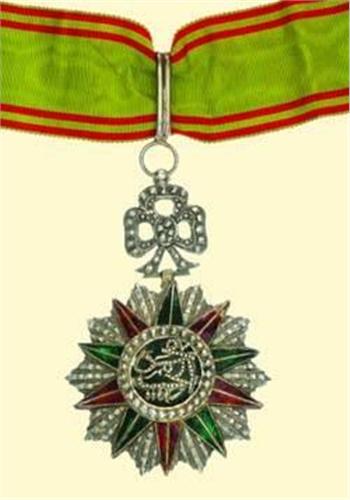 Commander's Decoration - Type Mohamed el Habib; neck badge, silver brilliant cut, superimposed parts red and green enamelled, with ornament above and original suspension loop, with Tunisian hallmarks; with original ribbon. Fine North African quality, with stylized cypher of Mohamed el Habib, but some signs of wearing, enamel damage.