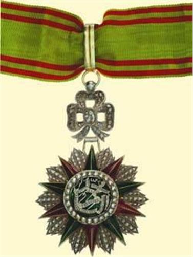 Commander's Decoration - Type Mohamed el Naceur; neck badge, silver brilliant cut, partially red and green enamelled (superimposed gilt rays), with ornament above and original suspension loop, French hallmarks, with original ribbon. Extremely fine French quality with tiny signs of wearing and cleaning!