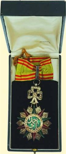 Commander's Decoration - Type Sidi Ahmed; neck badge, silver brilliant cut, partially red and green enamelled, with ornament above and original suspension loop, with Tunisian hallmarks, with original ribbon and original box of issue (ARTHUS BERTRAND, Paris). Very fine French quality with stylized cypher of Sidi Ahmed, in near best condition!