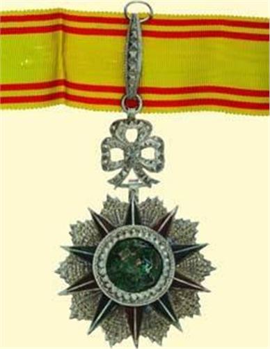 Grand Cross Set - Type Mohamed el Naceur (1906-1922); sash badge, silver brilliant cut, partially red and green enamelled, with ornament above and original suspension loop, French hallmarks, with original complete sash; breast star, silver brilliant cut, medallion green enamelled, with long sharp points, large size; wide tapered pin and two side hooks on reverse, French hallmarks. Excellent French quality with stylized cypher of Mohamed el Naceur, small enamel damages on badge (at points); extremely cleaned. Very attractive and rare set!