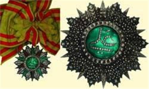 Grand Cross Set - Type Ali Bey (1882-1902); sash badge, silver brilliant cut, partially red and green enamelled, with ornamental suspension loop and original sash; Arabic mark on reverse; breast star, silver brilliant cut, medallion green enamelled, wide flat pin and twp side hooks on reverse, with Arabic mark. Fine old Borth African quality with stylized cypher Sidi Ali IV (Ali Bey), signs of wearing and enamel damages.