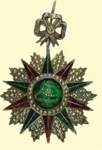 Grand Cross - Type Ali Bey; sash badge, silver brilliant cut, partially red and green enamelled, with ornamental suspension loop, with Arabic mark on reverse. Fine North African quality with stylized cypher of Ali Bey, signs of wearing, simple enamel's quality.