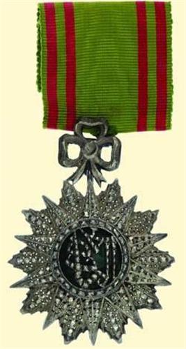 Knight's Decoration - Type Mohamed es Sadok; breast badge, silver brilliant cut, green enamelled medallion, with ornamental suspension loop; Arabic mark on reverse; with original ribbon. Very fine North African quality with stylized cypher of Bey Mohamed es Sadok; very fine condition!