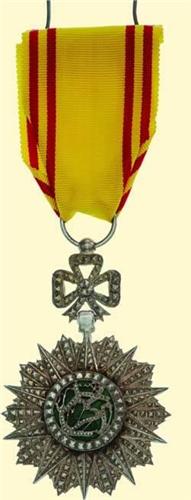 Knight's Decoration - Type Mohamed el Naceur; breast badge, silver brilliant cut, medallion green enamelled, with ornament above and suspension ring, French hallmark and maker's mark; with new ribbon. Very fine French quality, with stylized cypher of Mohamed el Naceur, near best condition!