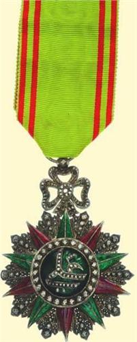 Knight's Decoration - Type Ali Bey; breast badge, silver brilliant cut, superimposed parts gilt and red and green enamelled, with ornament above and suspension ring with original ribbon. Excellent European quality with stylized cypher of Ali Bey, damages on points, signs of wearing, very attractive!