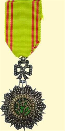 Knight's Decoration - Type Mohamed el Naceur; breast badge, silver brilliant cut, medallion green enamelled, flat version, with ornament above and suspension ring, French hallmarks; with new ribbon. Very fine French quality, with stylized cypher of Mohamed el Naceur, fine old patina.