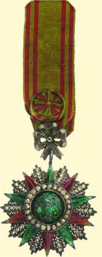 Officer's Decoration - Type Mohamed el Naceur; breast badge, silver brilliant cut, partially red and green enamelled, with ornamental suspension loop, Arabic mark on reverse; with original ribbon. North African quality with stylized cypher of Mohamed el Naceur, significant signs of age and wearing, some patina.