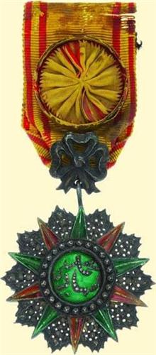 Officer's Decoration - Type Sidi Ahmed; breast badge, silver brilliant cut, partially red and green enamelled, with ornamental suspension loop and original ribbon with rosette. Fine North African quality with stylized cypher of Sidi Ahmed; small signs of wearing and dark patina!