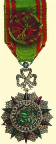Officer's Decoration - Type Mohamed el Naceur; breast badge, silver brilliant cut, partially red and green enamelled superimposed parts, with ornament above and original suspension ring, with French swan-mark, with original ribbon with rosette. Fine French quality with stylized cypher of Mohamed el Naceur, some enamel damages.