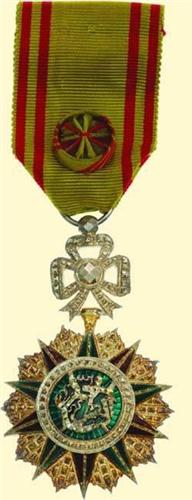 Officer's Decoration - Type Mohamed el Naceur; breast badge in three-quarters size, silver brilliant cut, obverse slightly gilt, partially red and green enamelled, with ornament above and original suspension ring, with original ribbon with rosette. Excellent European quality, with stylized cypher of Mohamed el Naceur; very attractive!