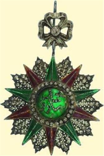 Order's Decoration - Type Side Ahmed; sash or neck badge, silver brilliant cut, partially red and green enamelled, with ornamental suspension loop, Arabic mark on reverse. Fine North African quality with stylized cypher of Sidi Ahmed, signs of age and wearing, some patina.