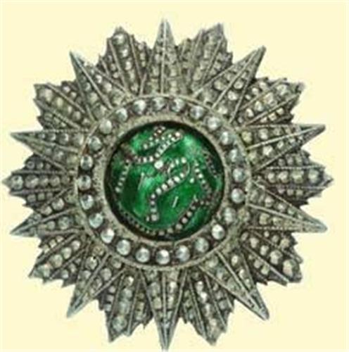 Order's Badge - Brooch, Type Mohamed el Naceur; breast badge with pin back, silver brilliant cut, medallion green enamelled, connection and ornamental bow have been removed, horizontal pin on reverse. Privately changed badge with enamel damages, some signs of wearing and cleaning.