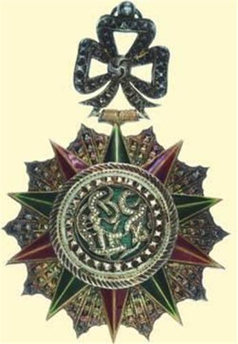 Order's Decoration - Type Mohamed el Habib; sash or neck badge, silver brilliant cut, superimposed parts red and green enamelled, with ornament above and suspension ring. Superb European quality, with stylized cypher of Mohamed el Habib, in excellent condition and untouched patina! Rare in this quality!