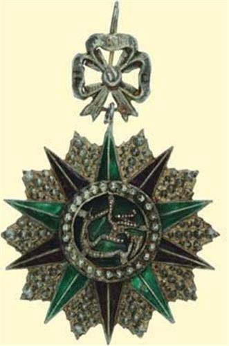 Order's Badge - type Mohamed el Naceur; sash or neck badge, silver brilliant cut, partially green enamelled, with ornamental suspension loop (hollow stamped!), with Tunisian hallmarks. North African quality with stylized cypher of Mohamed el Naceur; some signs of wearing and polishing, enamel damages.