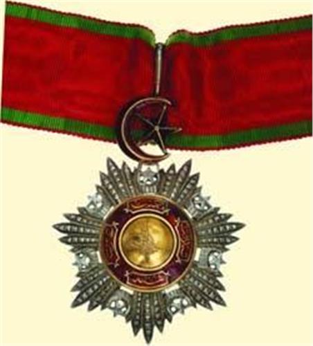 Commander's Decoration (3rd class); neck badge, silver brilliant cut, medallion gold resp. gilt and partially enamelled, with enamelled crescent and star suspension loop above (with gold onlay); official mark, hallmarks (also on obverse) and zigzag line; with original ribbon. Small signs of wearing (tiny enamel damages).