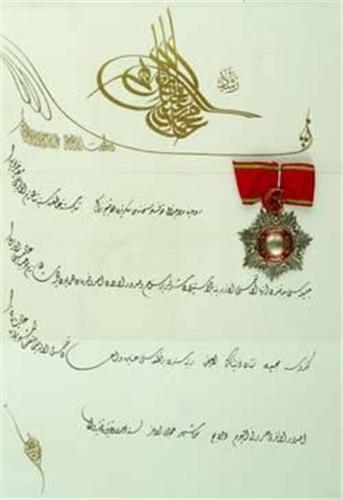 Commander's Decoration (3rd class); neck badge, silver brilliant cut, medallion gilt and partially enamelled, with gilt and enamelled crescent and star suspension loop (lacquer-enamel repair!); official mark and hallmark on reverse; small piece of original ribbon. Fine old quality, some repair and significant signs of polishing. With large Turkish awarding diploma (to Mr. Laptew / 1912).