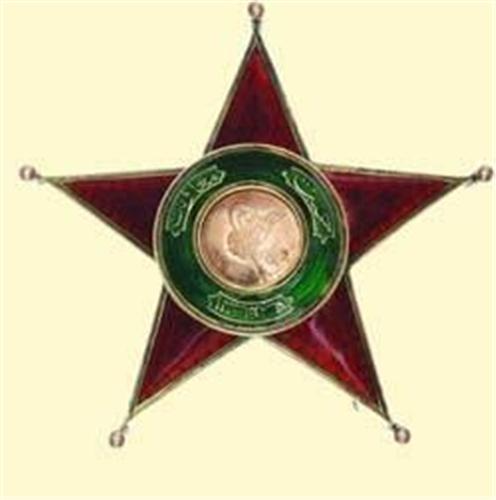 Decoration of 3rd Class; breast badge, five pointed red enamelled gold star with partially green enamelled medallion, horizontal pin of later restoration on reverse; gold containing alloy ("333" mark), obverse enamelled; hollow badge of excellent quality, but later changes: silver rays with enamelled flowers-wreath have been removed just as crescent and star suspension and star in wreath on reverse; small enamel damage on green medallion.